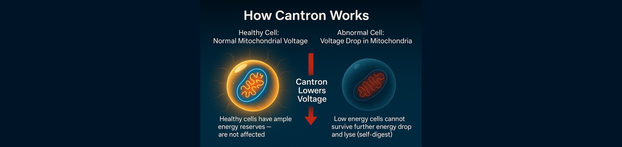 - In abnormal cells, Cantron helps push the mitochondrial voltage downward, below the threshold where primitive cells can sustain themselves. In this state, they regress further into primitiveness and ultimately lyse—self-digesting because their energy system collapses.